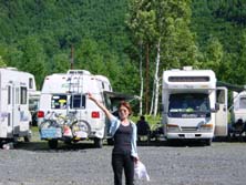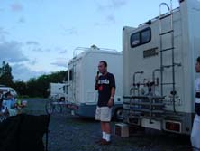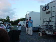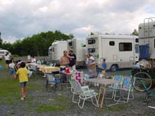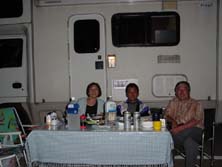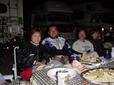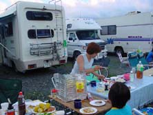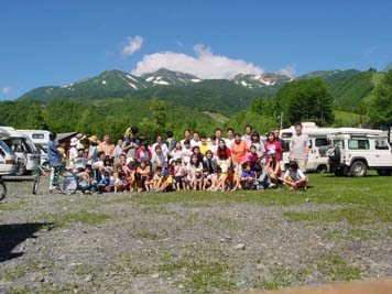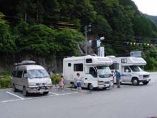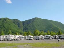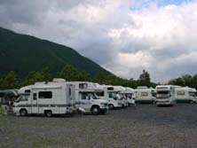すでに10数台のキャンピングカ−が揃っている。これは壮観である!前日からの参加組も含め、すでに宴会?も始まっているようだ。