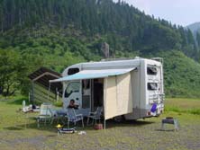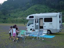やはりいましたキャンプ組。3段の駐車場に10数台のテント組、そして3・4台のキャンパーが。