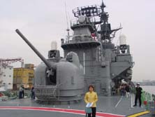 「はたかぜ」5インチ単装速射砲前で(似合ってる?) 深谷まりなっちとタエコ