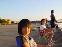 ミカとカズマサも竿を持たされ、静かにリールを上げ下げしてます。