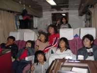 森田家の中型バス内。まるで映画館のようで仲良く「千と千尋」の観賞タイム。