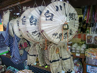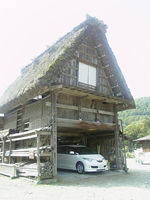 白川郷の笠と草履のお土産、そして可愛い合掌造りの車庫。