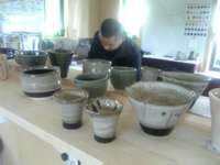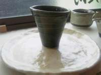 自分で作った焼酎グラスです・・・、ちなみに下の白くて丸いのはTAEKO作のお皿です。