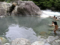 橋の下にある新穂高の湯は、奥飛騨温泉郷の中でもトップクラスの有名露天風呂。