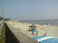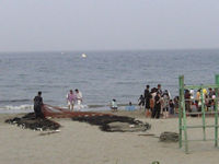 手前の海岸では、地引網を楽しんでいる人達がいました。
