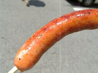 地べたに適当にとうもろこしや桃などが並んでいる。