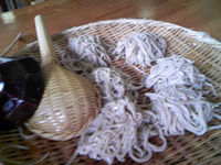 しばらくすると、おねーさんが大きなざるに盛られたそばと鉄鍋を持ってきた。
