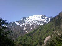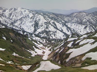 ベンチに座っていると、目の前には万年雪の塊や厳寒の冬を越してきた古びた旅館などがあり、飽きない。