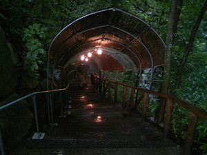 大きな鳥居と門をくぐってながーい階段を下りていく。