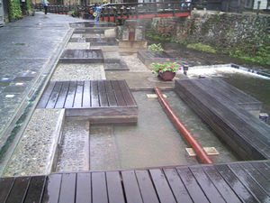 10分ほど歩いて再び温泉街に舞い戻ると、足湯がさびしそうに迎えてくれた。