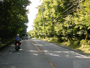 木陰の中を走れるので気持ち良い。私は今回のキャラバンで初めてのバイク!