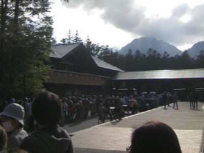 上高地行きのバス待ちのお客が多くて、案内のおじさんは補助席まで詰め込んでいく。