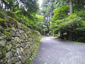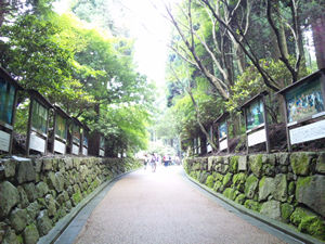 駐車場から3分ほどで木立に囲まれた参道へ。