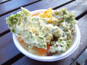 余りの人の多さに数分で下り、地元の山菜&きのこ汁を食べ再び草津へ。