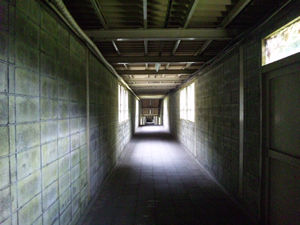 右の写真の廊下の奥の奥に下りていく階段があるみたい。