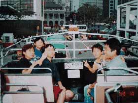 オープントップバスは2階の一番前がベストポジション。高層ビル街の合間をぬうように走り、頭の上を樹木の枝や