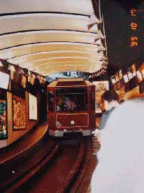 9人はいよいよピークトラムのホームに向かった。そこは見ての通り(右写真)、結構急なホームである。